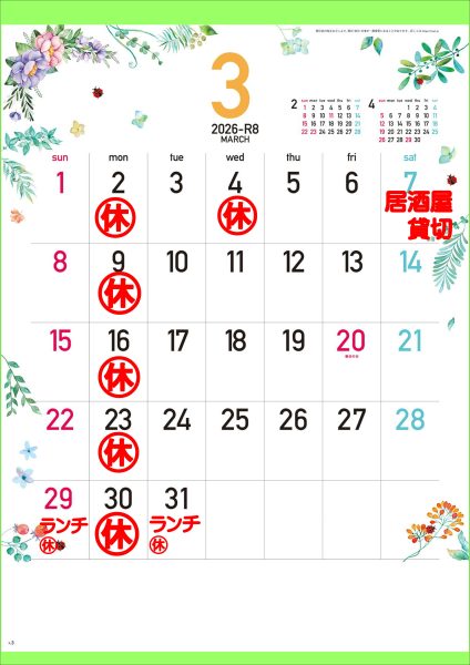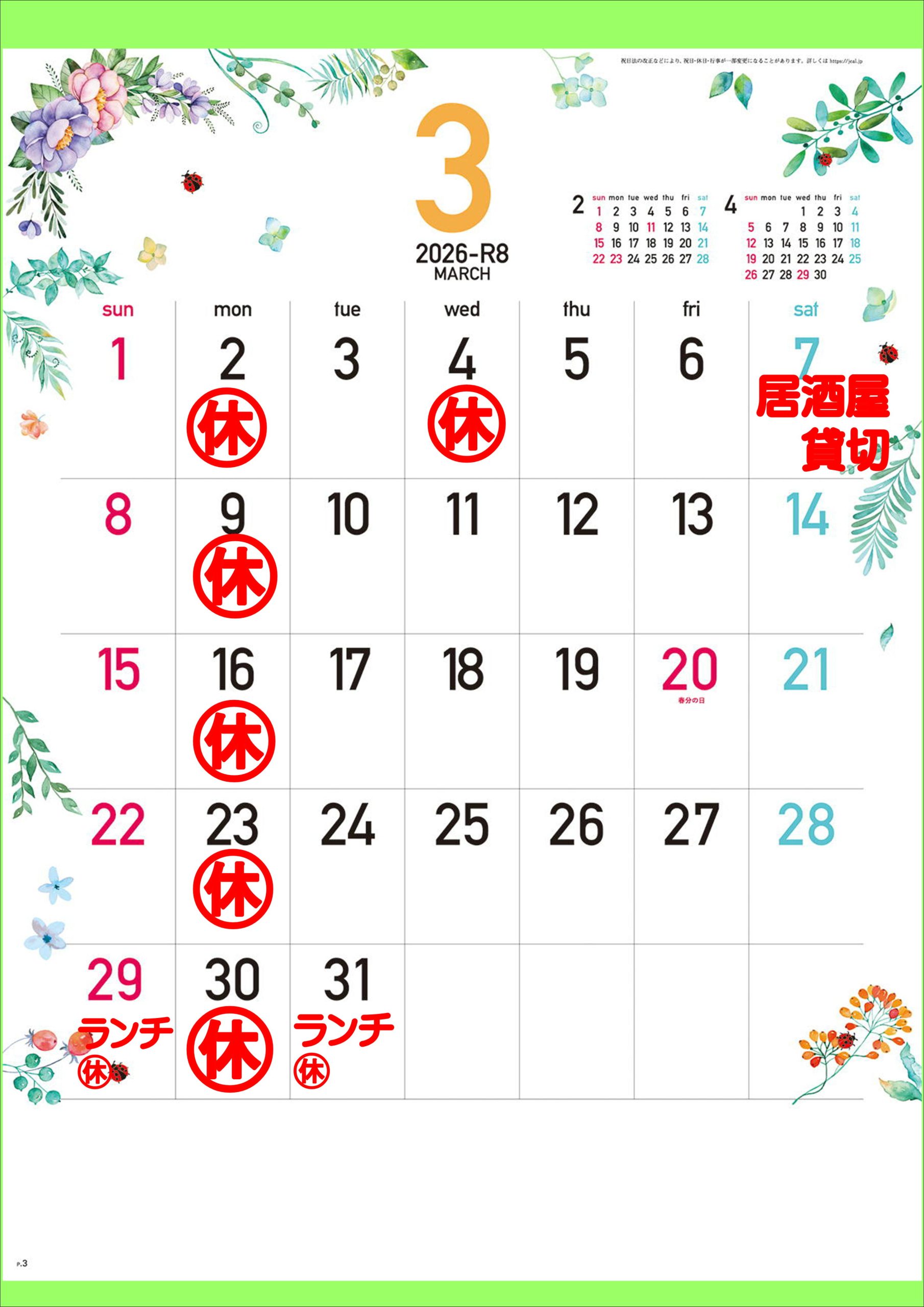 2026年3月休業日のお知らせ